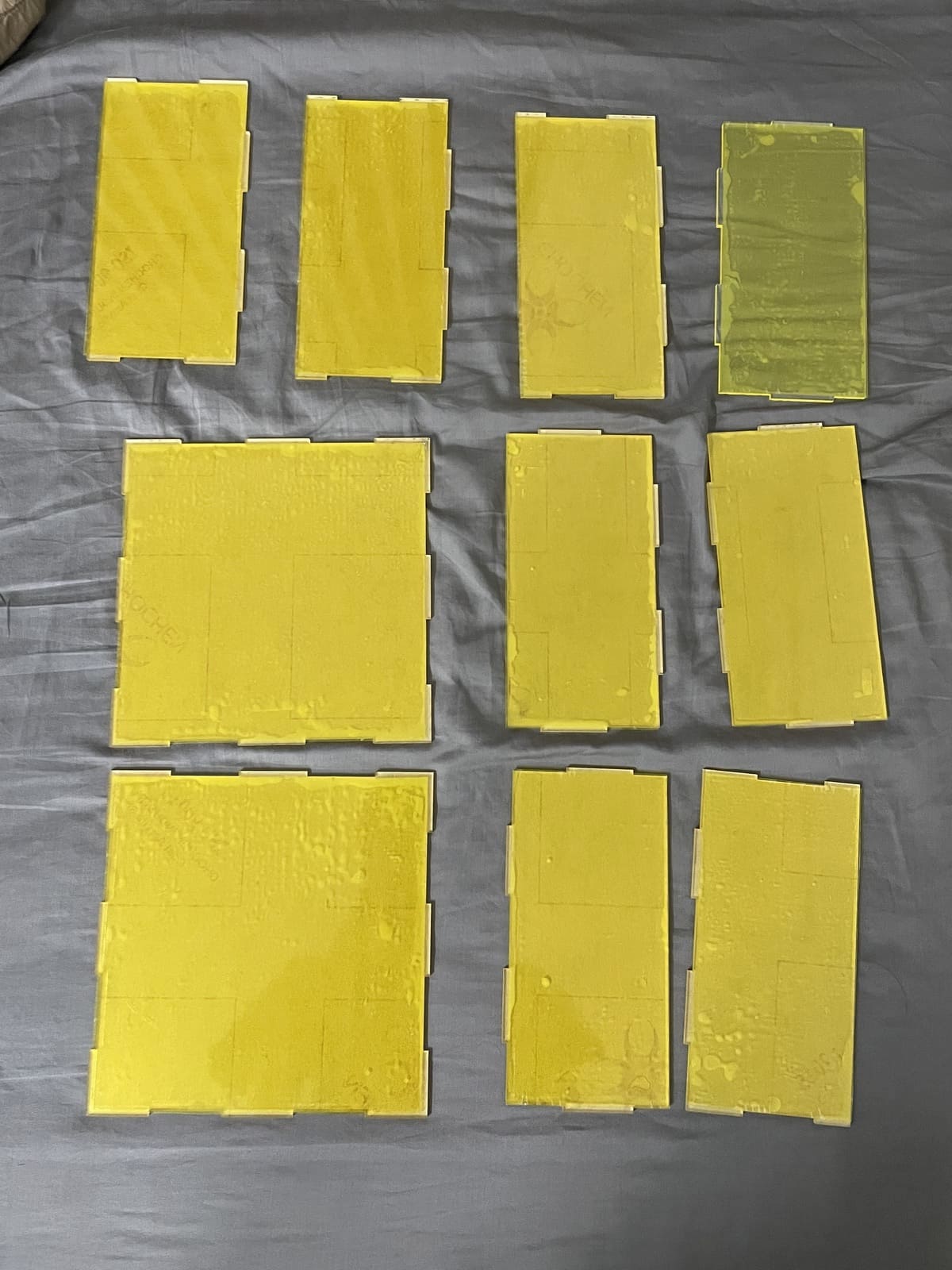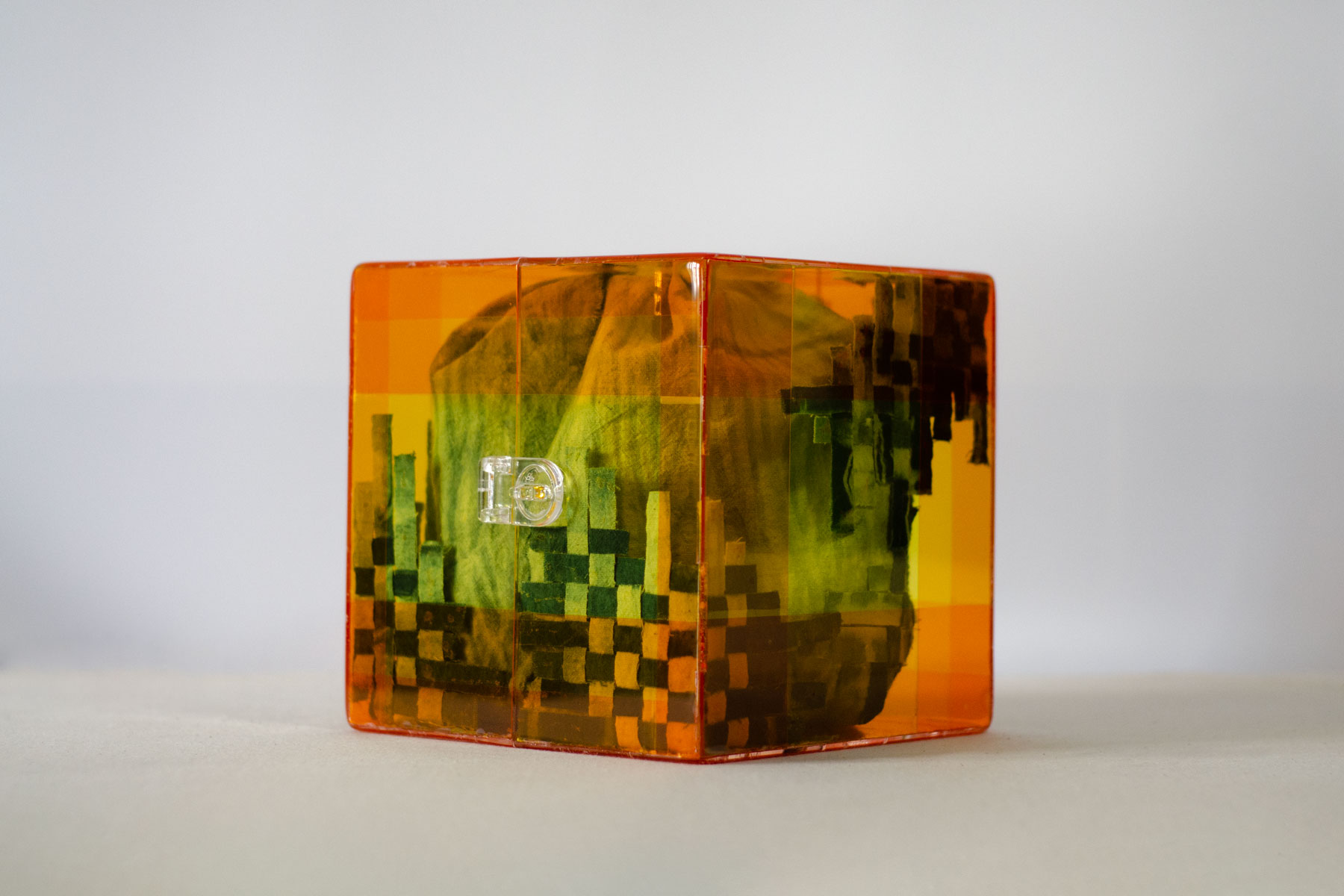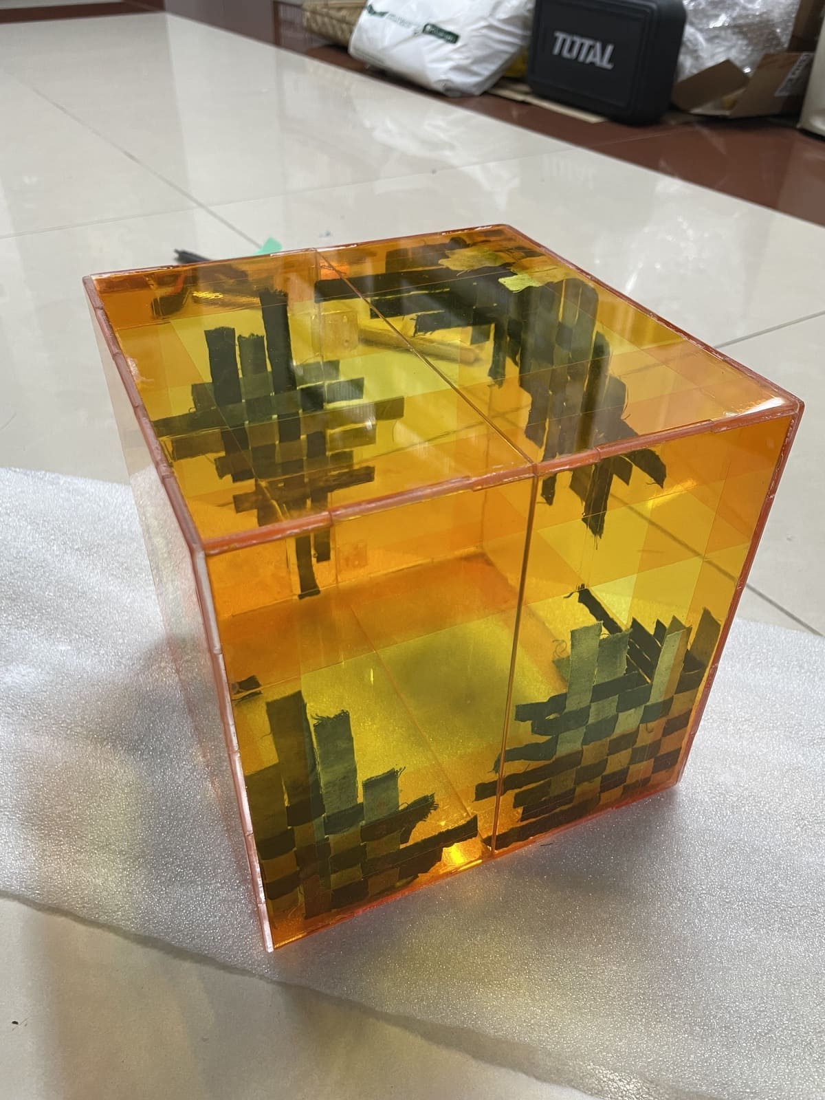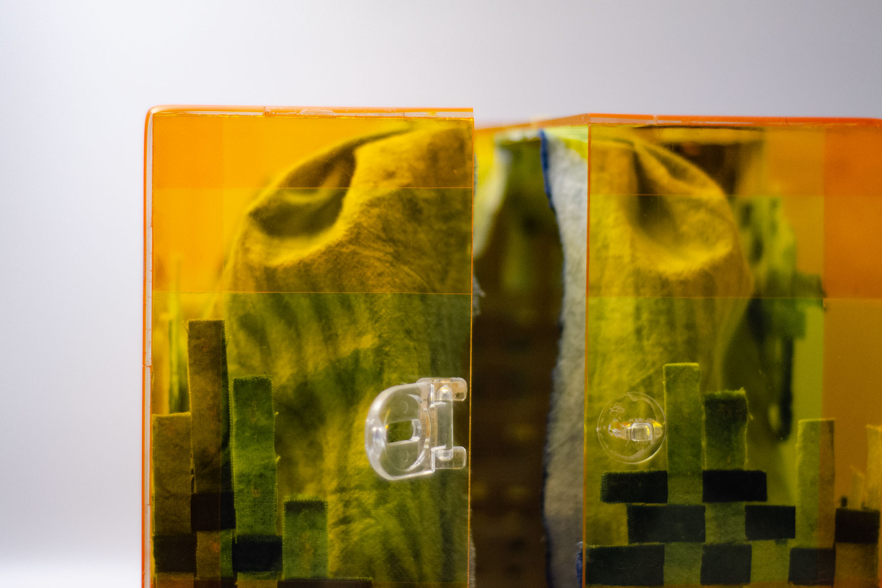 The acrylic box represents the present time, specifically her apartment in Saigon. To create the structure of the box, I designed the dieline on my computer and then had it laser-cut on a 3mm acrylic sheet (fig 1.1). I wanted the pieces to have a rigid bond, so I made those zigzag joints and later attached them with super glue (although I regretted using it). I tested whether I had the zigzag joints correct, and they fit perfectly (fig 1.2). I wanted to add a yellow overlay color over the box to replicate the sleeping lamp during her sleep. At first, I thought of buying transparent colored acrylic sheets, but they were a lot more expensive than the clear ones, so I searched for an alternative solution. Car light cover stickers turned out to be the problem solver. I cut the stickers to the size of each piece and then stuck them to the inner face of the box. I added layers of orange stickers over the yellow one to mock the light spread (the closer to the center of the light, the brighter) (fig 1.3-1.5, 1.7-1.8). For better handling, I then glued the box together while still having the protective sheet and sanded down the sharp edges (fig 1.6). 2 sides of the box were connected using 3 removable clear plastic hinges (fig 1.7-1.8).