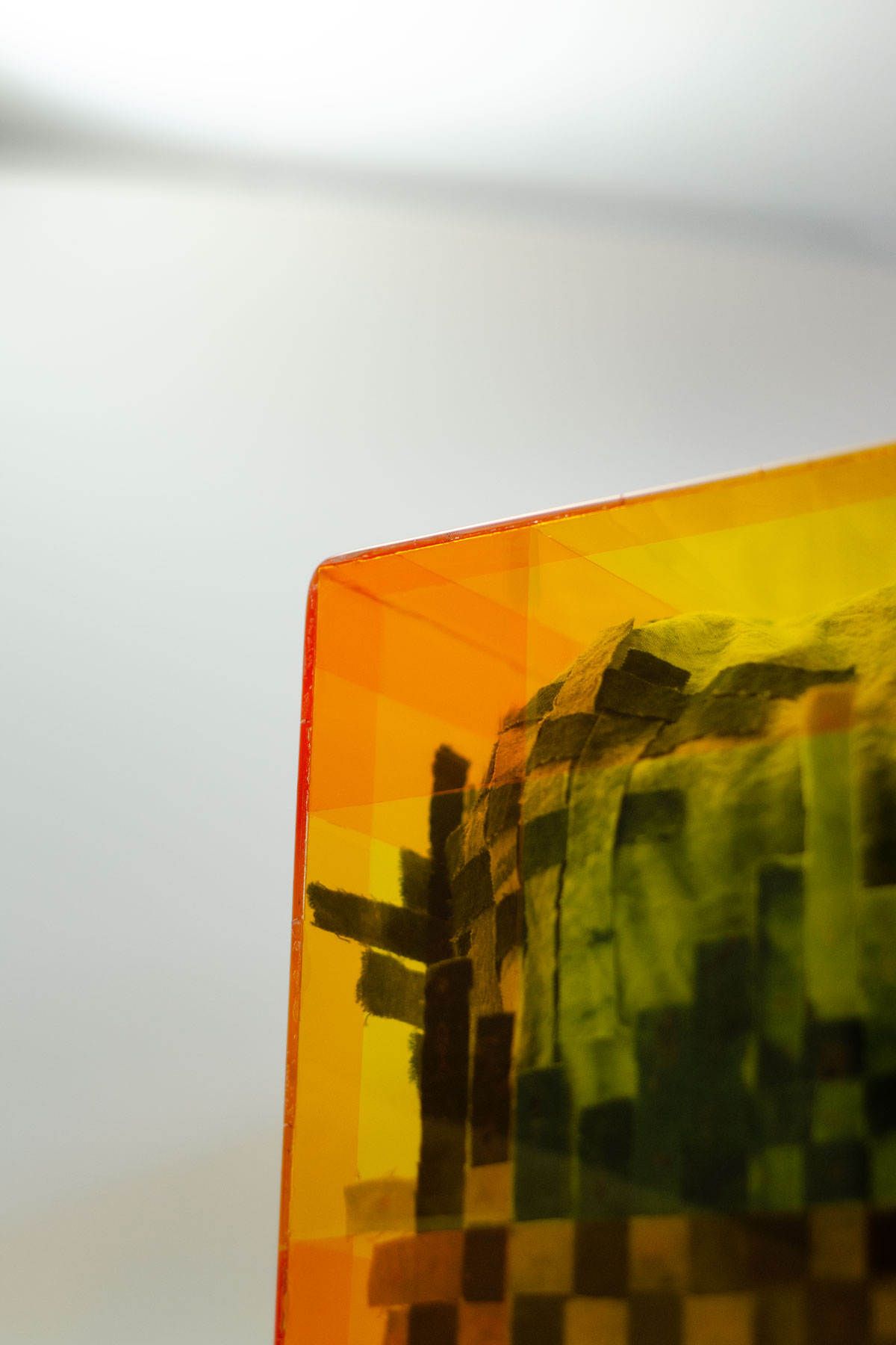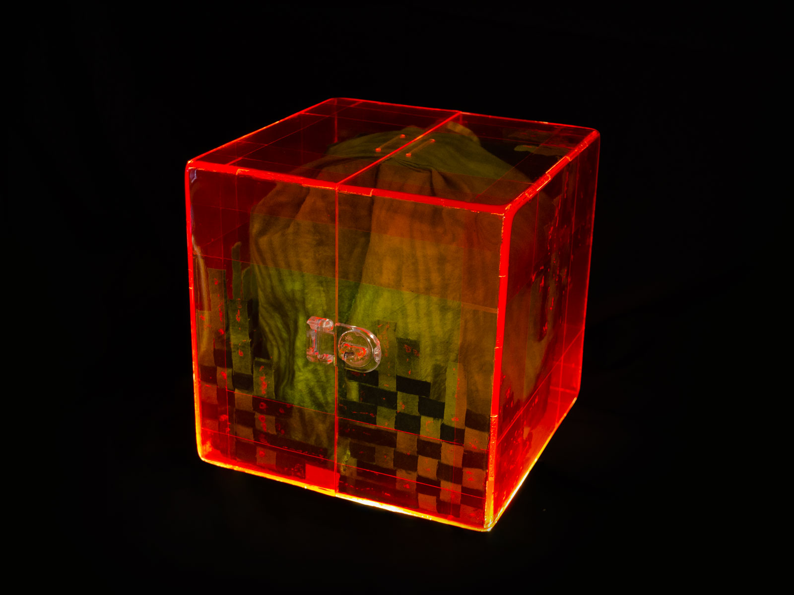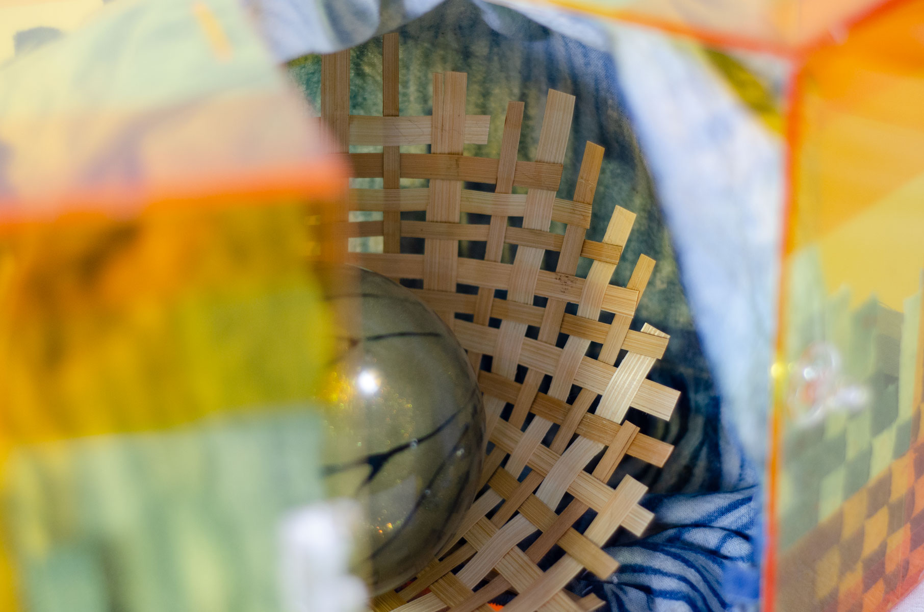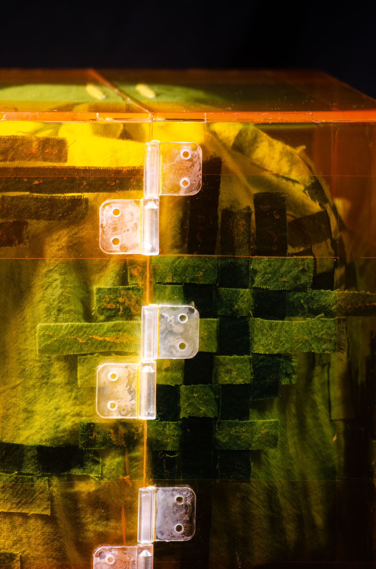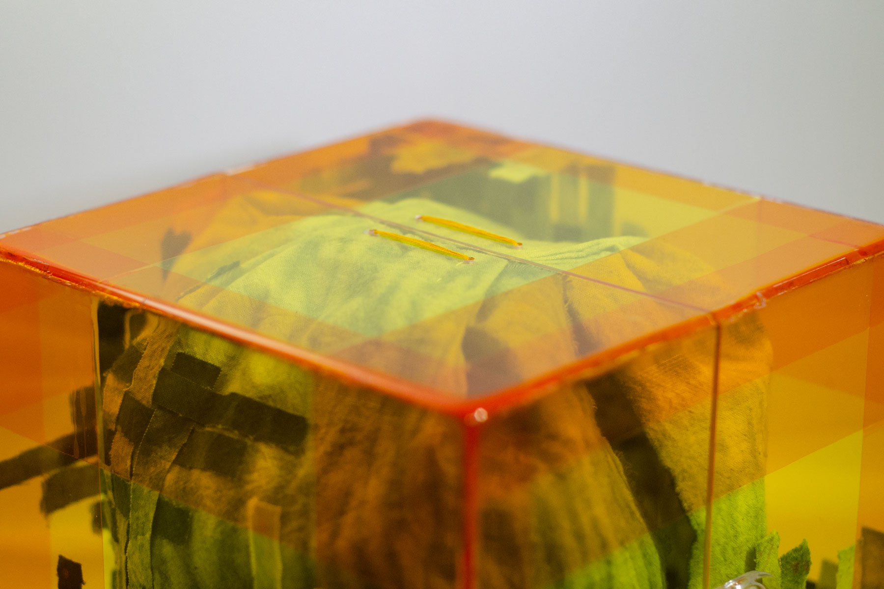 Additional element (1): Some of the dyed fabric was cut up and woven into checkerboard patterns, just like in the bamboo box (fig 5.6). They were attached to the inside of the acrylic box (fig 5.7), as well as the outside of the fabric box (fig 5.8). My intention was to create an abstract garden for her, shown through the box, and to create a coherent flow throughout all the different layers.