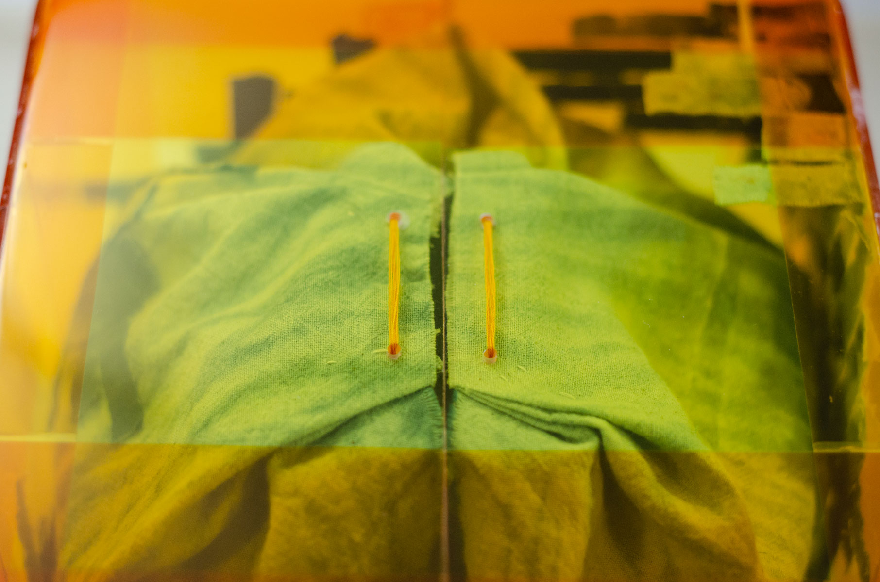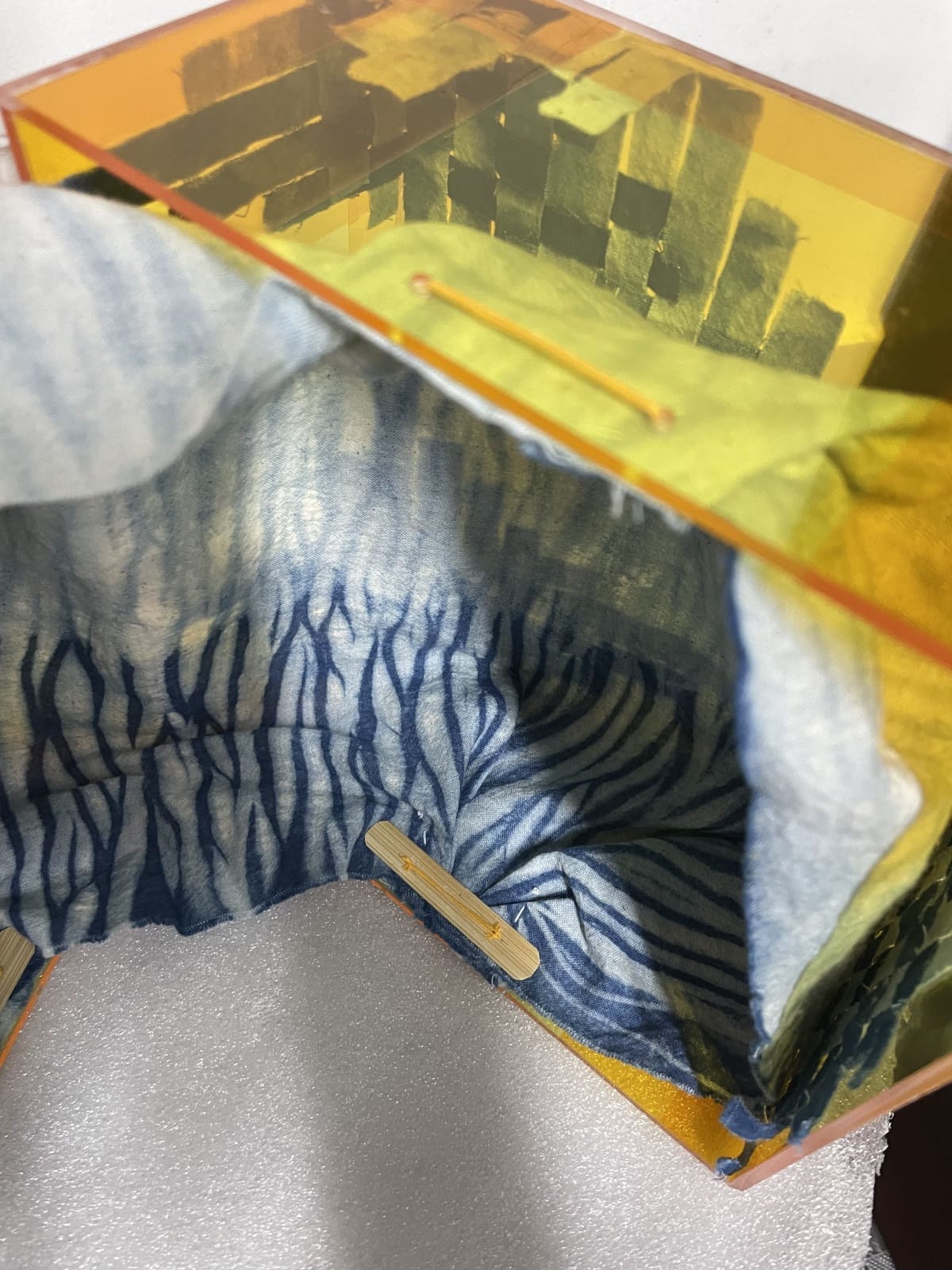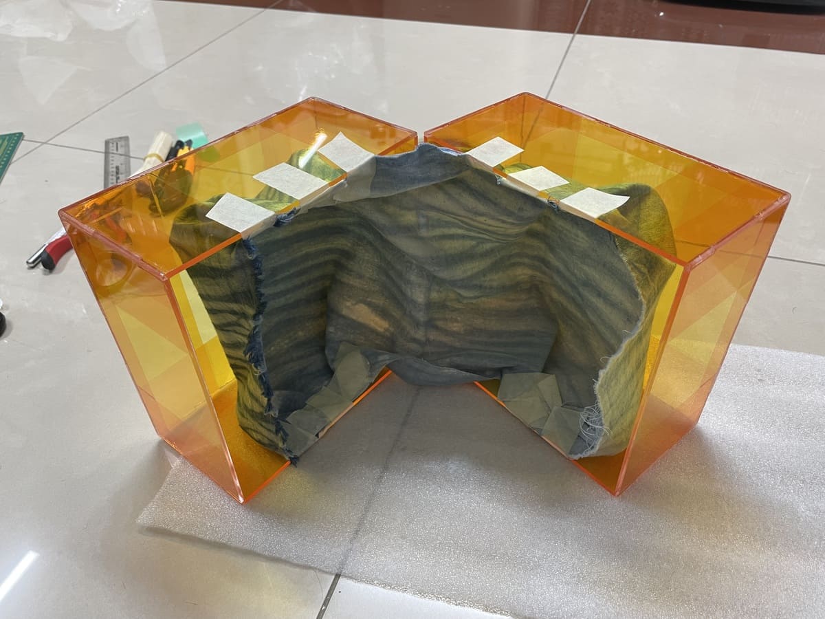 I tested attaching the fabric to the acrylic box with tape first to see how I could create the fabric box structure (fig 5.1-5.2). I drilled 4 holes on each side of the acrylic box, 2 on the top and 2 at the bottom, to attach the fabric with yellow cotton threads (fig 5.3-5.4). I also used pieces of bamboo to reinforce the connected parts; without them, the fabric would not keep its position (fig 5.5). The fabric patterns are shown more clearly here.