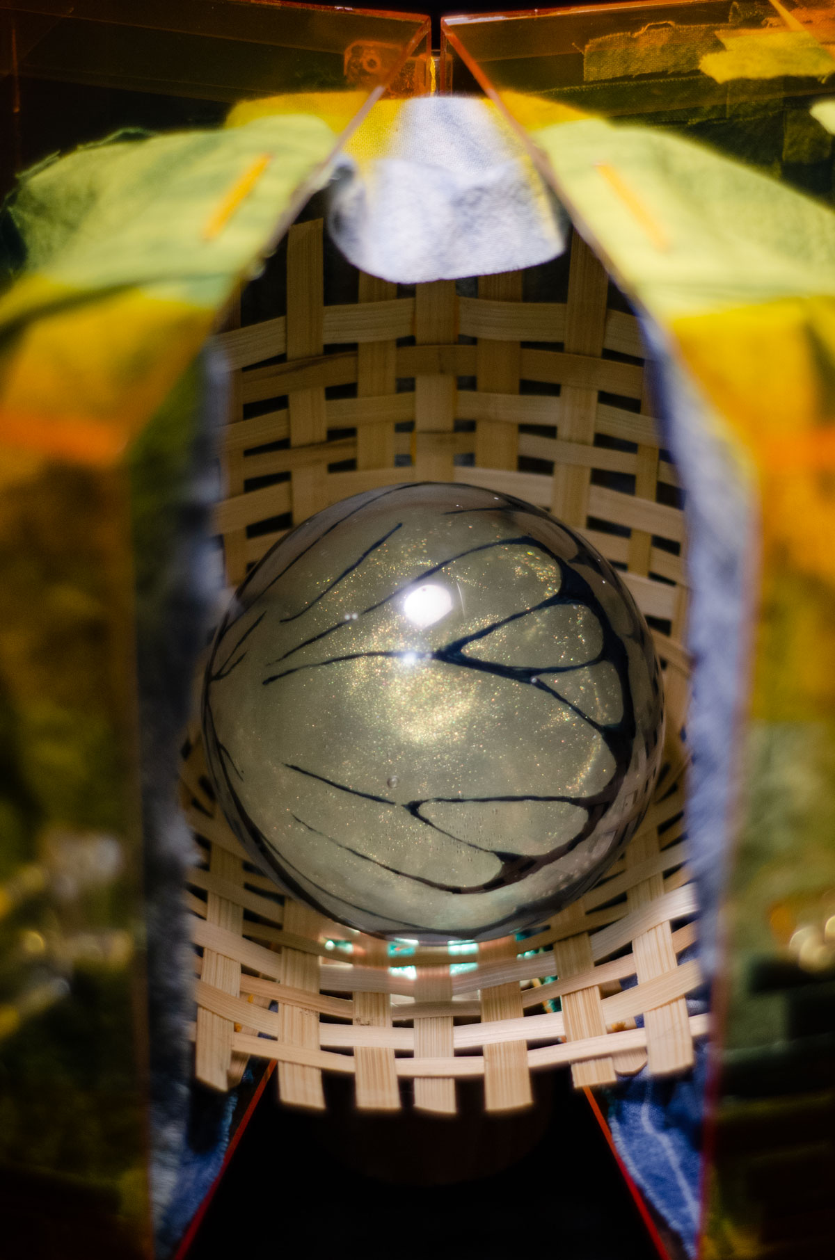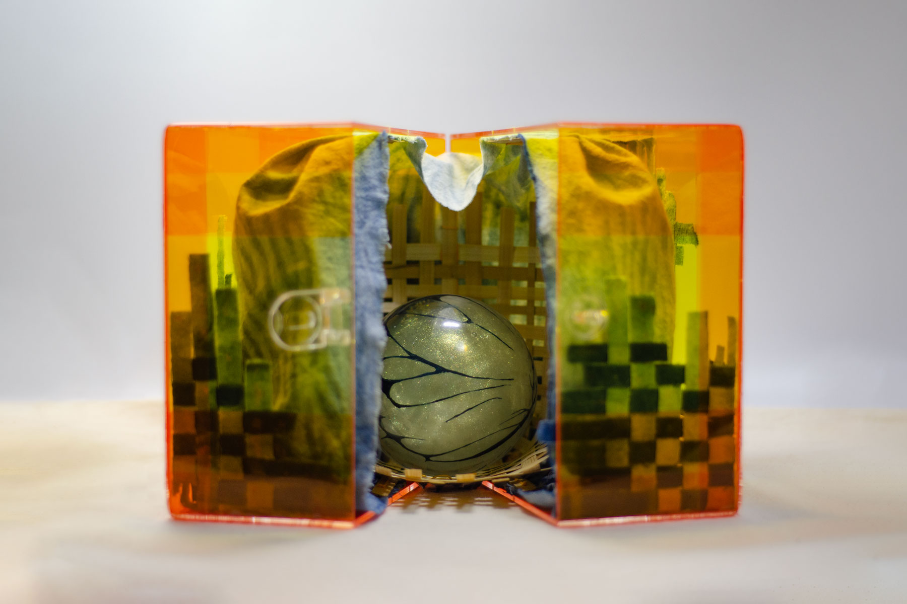 The meaning of the resin sphere might be the hardest to guess. When I decided to make Kén, in my early sketches, I planned to put a porcelain doll in the innermost box to represent herself, the owner of the sleep. The whole concept at that time was something like a Matryoshka, because there were boxes inside boxes. But after two days of searching for the best doll, I couldn't find one. That's why I decided to do something else. An idea about the sphere came to me; I remembered she once told me that she was a premature baby when her mother had an accident and had to give birth to her. Luckily, she was put in a NICU, which looked like a glass sterile chamber, for special care. I imagined her sleeping in the unit like a raw gem, waiting to shine and break out of the cocoon someday. That's why I thought of metamorphosis, accounting for the Monarch - King of butterfly wing’s pattern (fig 4.7).