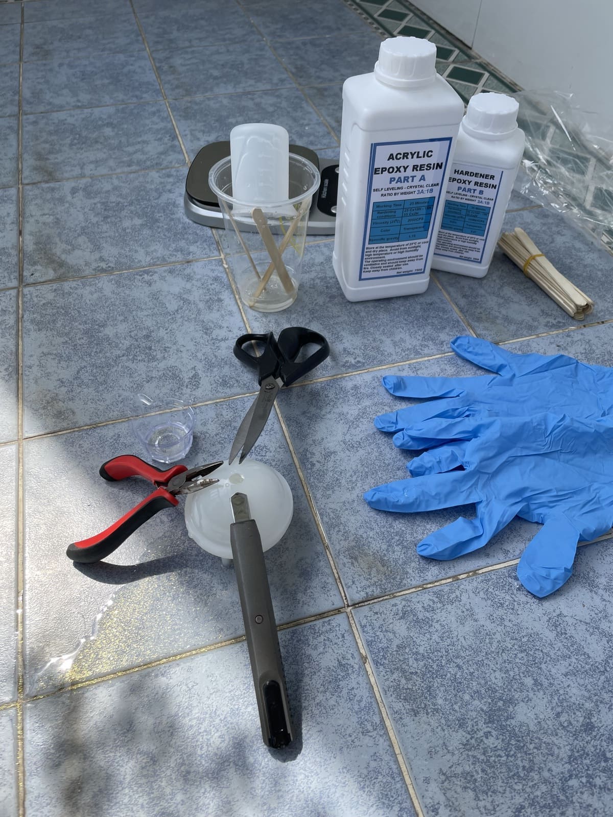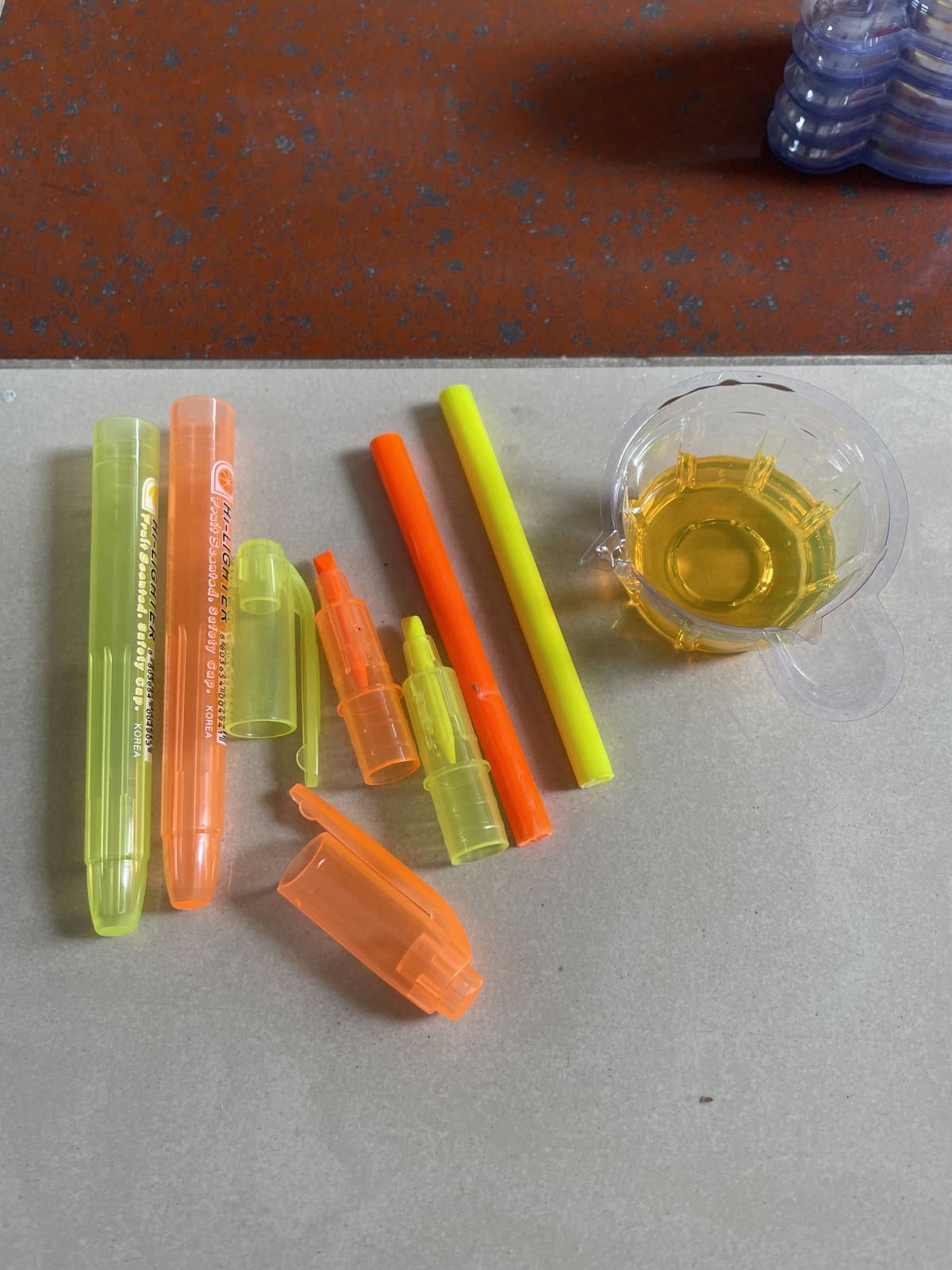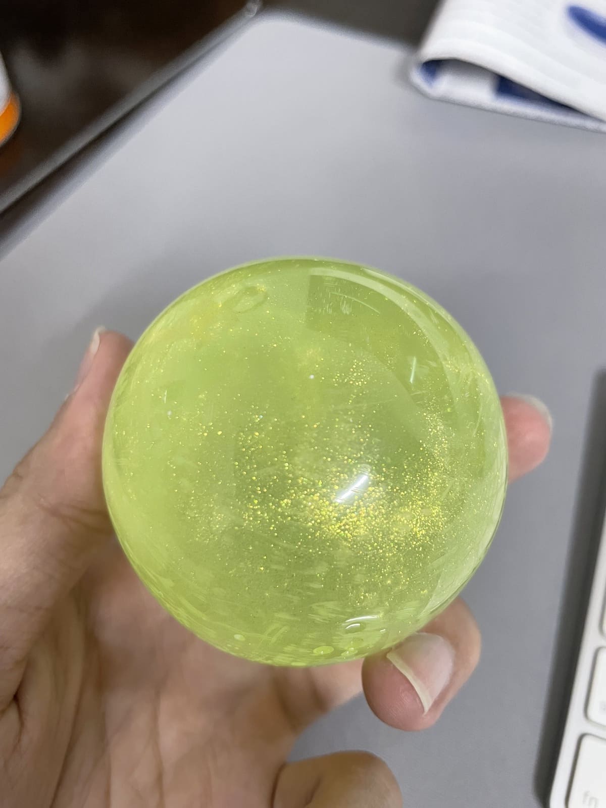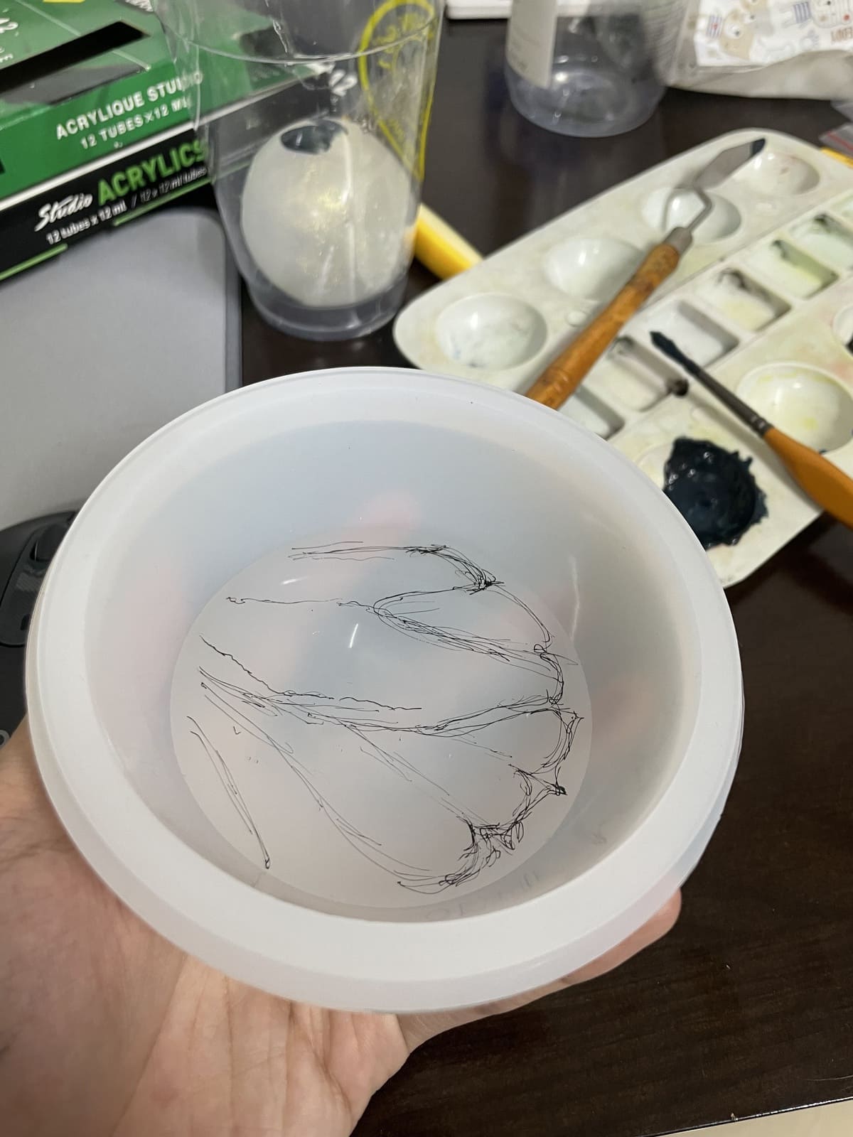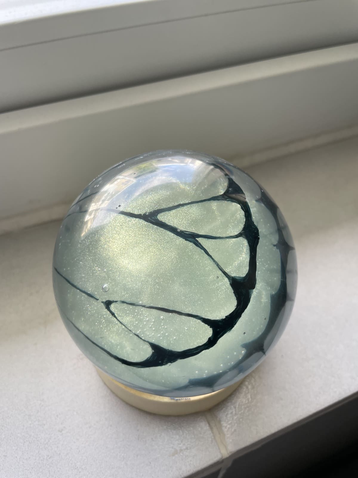 I made two spheres, a yellow one (fig 4.4) inside a clear transparent one (fig 4.6). For cost-saving purposes, I purchased two highlighters to mix the color of the wing for the small sphere (because they didn't have the exact color I wanted), and added yellow glitters to the mix (fig 4.1-4.2). However, when it cured in the mold, it changed to greenish yellow (fig 4.4). I decided to move forward with it because the due date was near, and I didn't want to wait another day for it to cure. The bigger sphere was more complex. For the pattern to appear inside the sphere and not outside, I tried out the technique of painting on multiple layers of resin, like in this 3D Koi fish painting. However, the size of the sphere was big, and pouring multiple layers of resin would result in a very long curing time. To be safe, I decided to do three layers of the pattern. After I poured 1/3 of the mold, I waited for a day and drew the pattern on the resin surface with acrylic paint (fig 4.5). Then I put the small sphere in the middle and poured resin over to 1/2 of the mold. I repeated the process until finished (fig 4.6). The sphere seemed to discolor when I left it under the sunlight for a few days. I also sanded and polished the two spheres by hand.