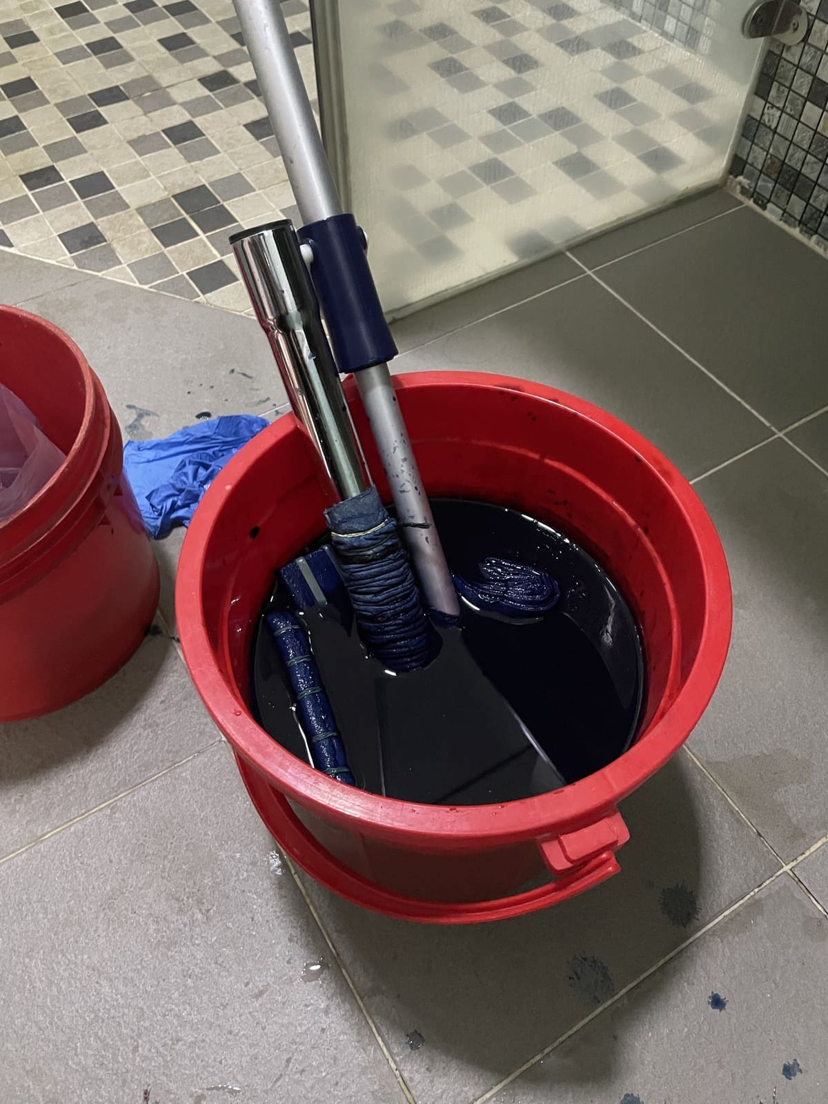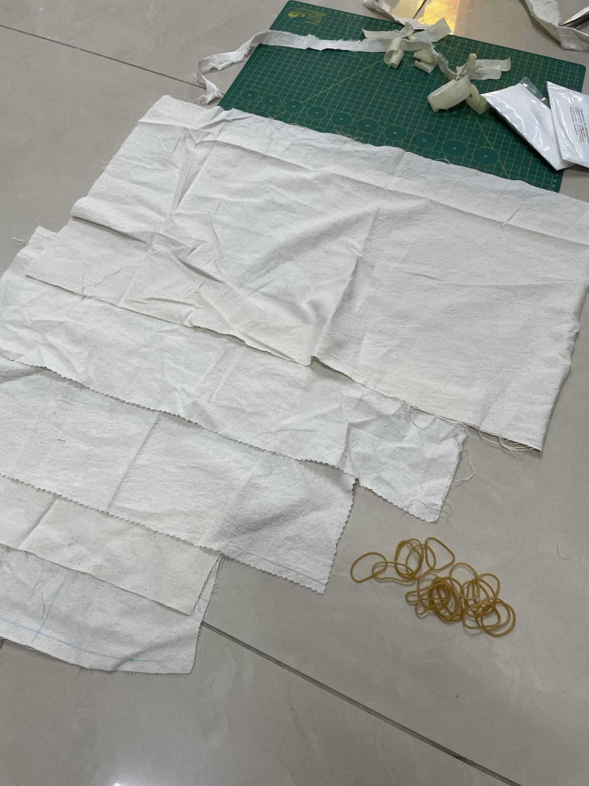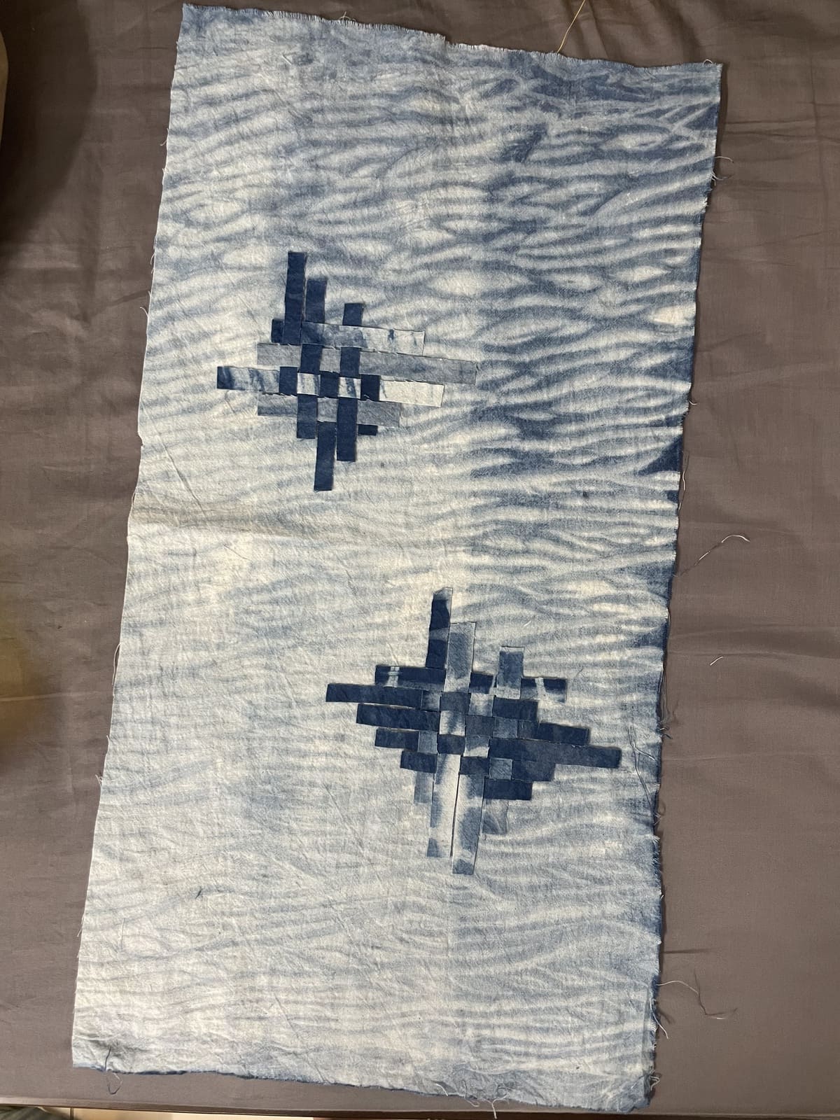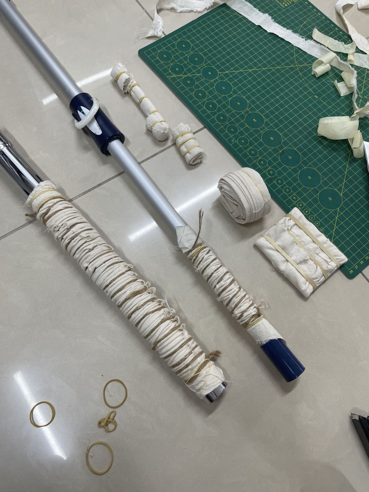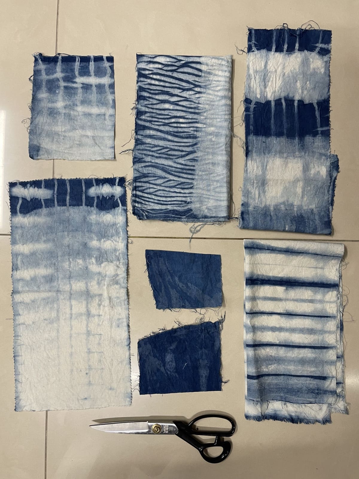 The fabric box represents her childhood sleeping in hammocks. When I thought of it, I became interested in the knots at two ends creating sharp marks on the fabric (fig 2.1). I wanted to recreate the look of those marks on the 2nd box. I found out about a Japanese fabric dyeing technique called Shibori, which uses ties and knots to create patterns on dyed fabric. There are many techniques of Shibori, but I only focused on doing arashi and itajime, the ones that create the pattern I wanted. I used raw cotton fabric that I already had at home (fig 2.2), cut it into various-sized pieces (fig 2.3), and used rubber bands, a mop stick, a vacuum cleaner extension tube (to save money), and wood plates/sticks to tie the fabric (fig 2.4). For the dyeing chemical, I used the Jacquard indigo tie-dye kit. The result came out really nice to me, although there were several issues like I hadn't prepared the fabric well, and the dye couldn't seep through some of the inner layers (fig 2.6).