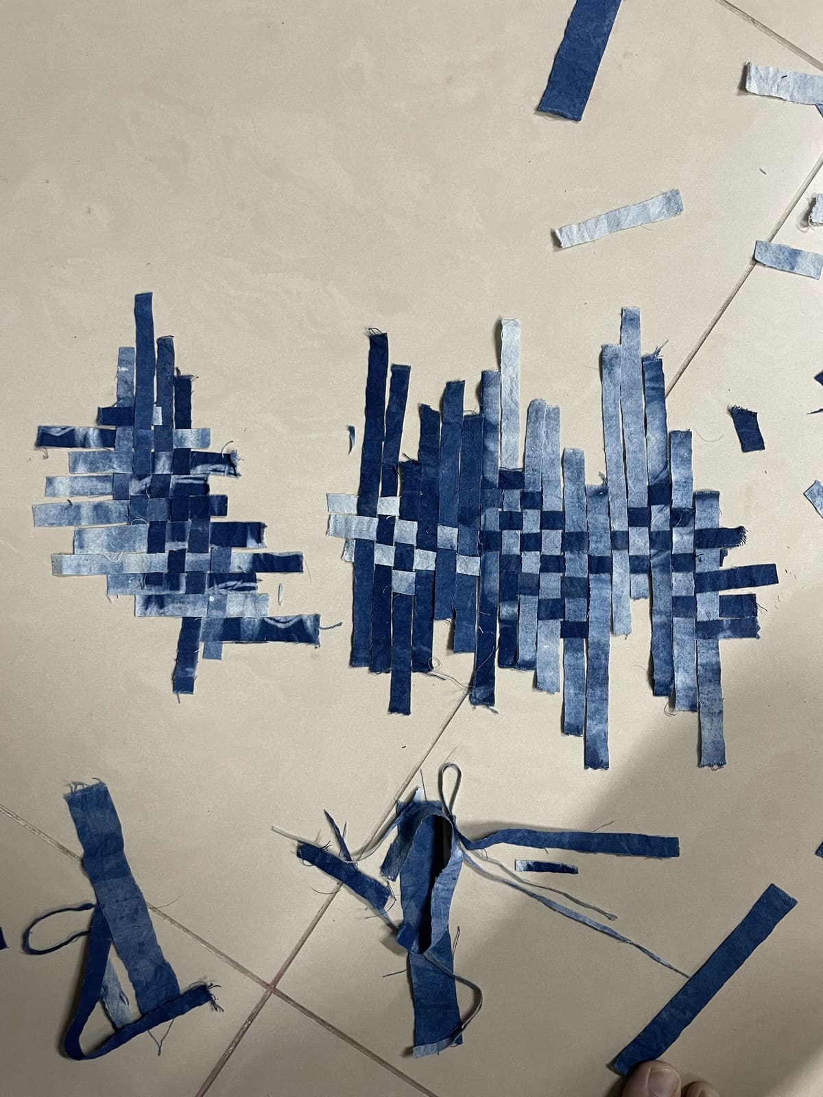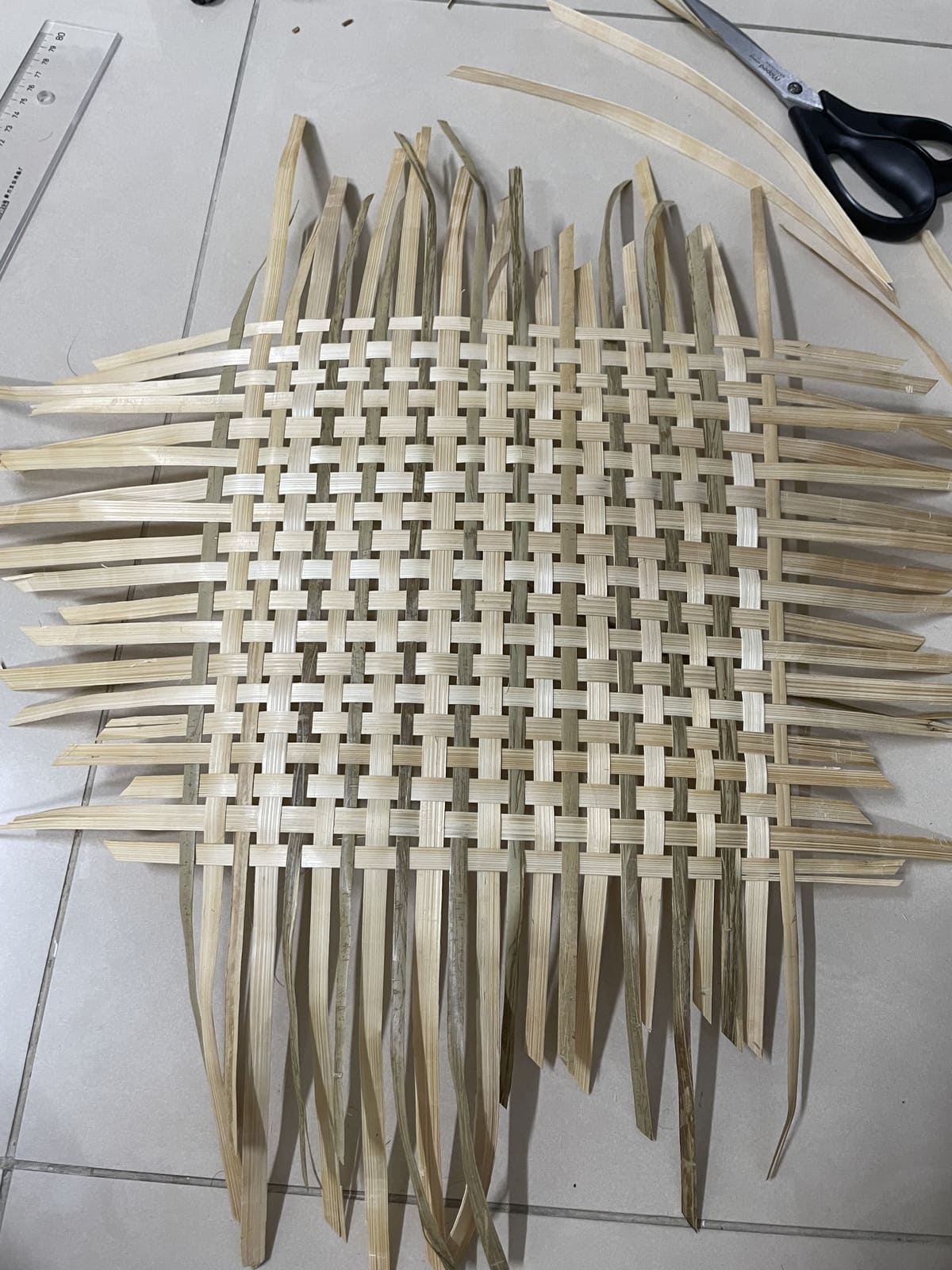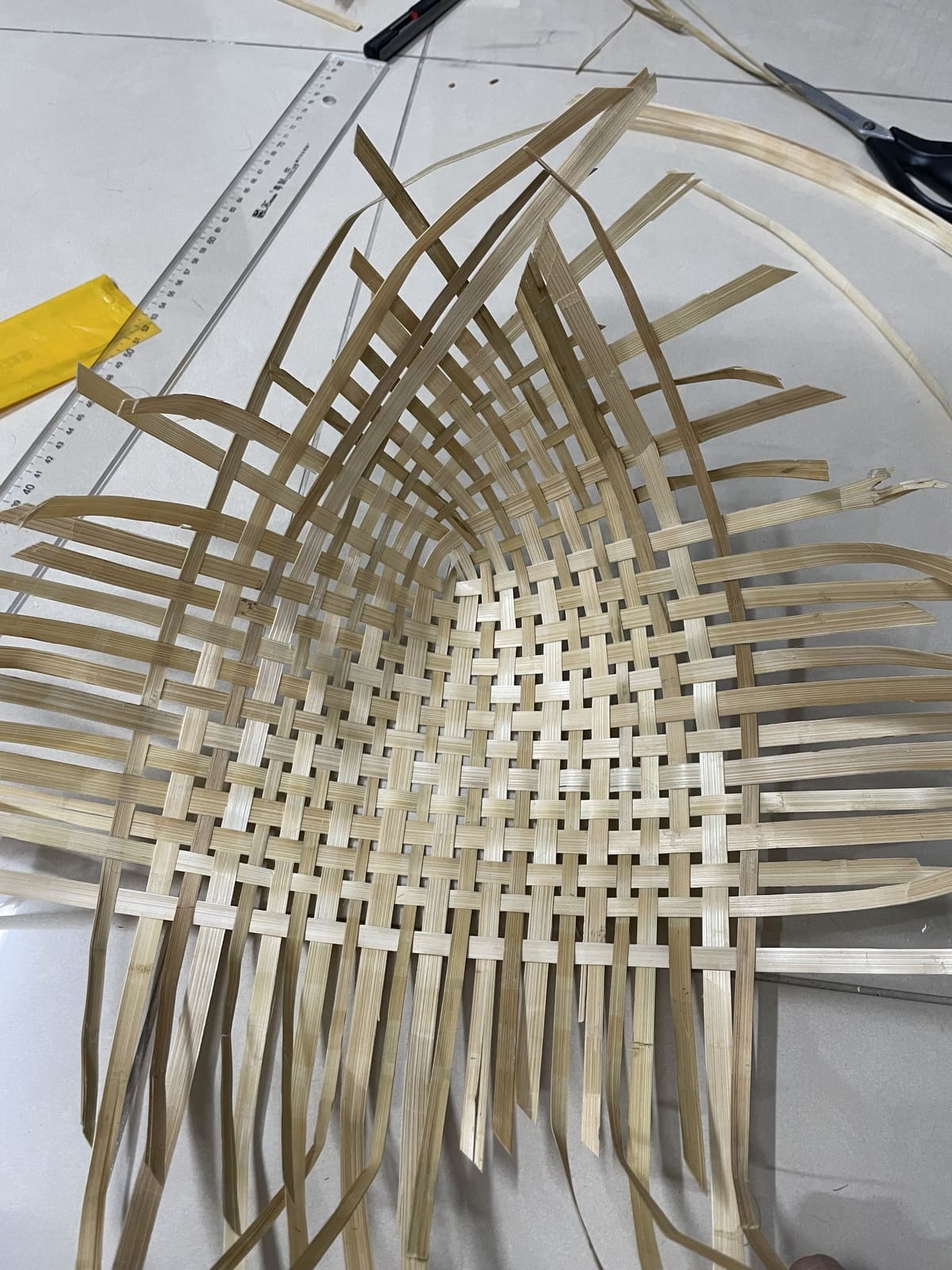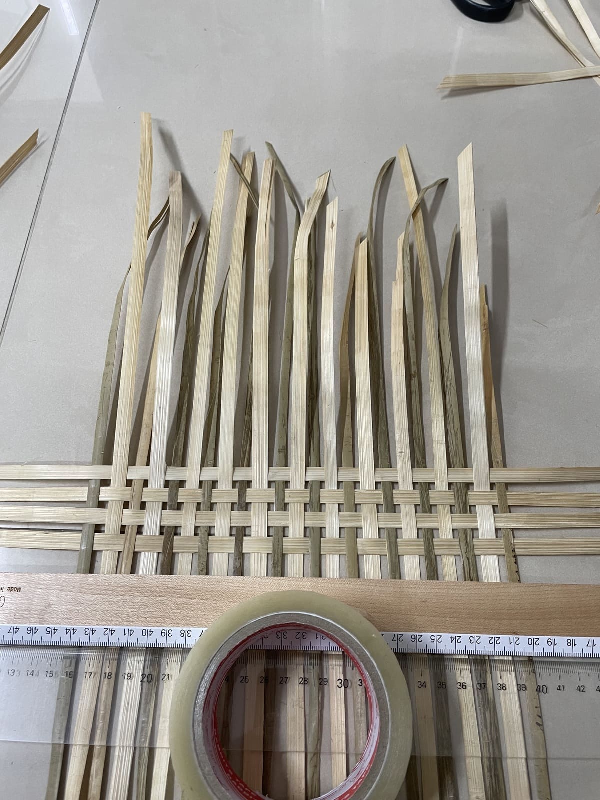 With the pieces dried, I tore the thick pieces in half to have the same width as the thin ones, so the pieces would be even like in the reference. Then, I started reweaving it. It was difficult at first because the pieces were not stretched out; they still deformed according to the shape of the gift box, but it got easier as I got used to it (fig 3.5-3.6). To figure out a way to fit the structure into the box, I wove them into a big flat square piece and then tried bending it to see how I could deal with it. As you can see in fig 3.7, I ended up bending the vertical pieces and weaving them together, which took quite an effort. This was only one side (left); I also had to bend the other side (right).