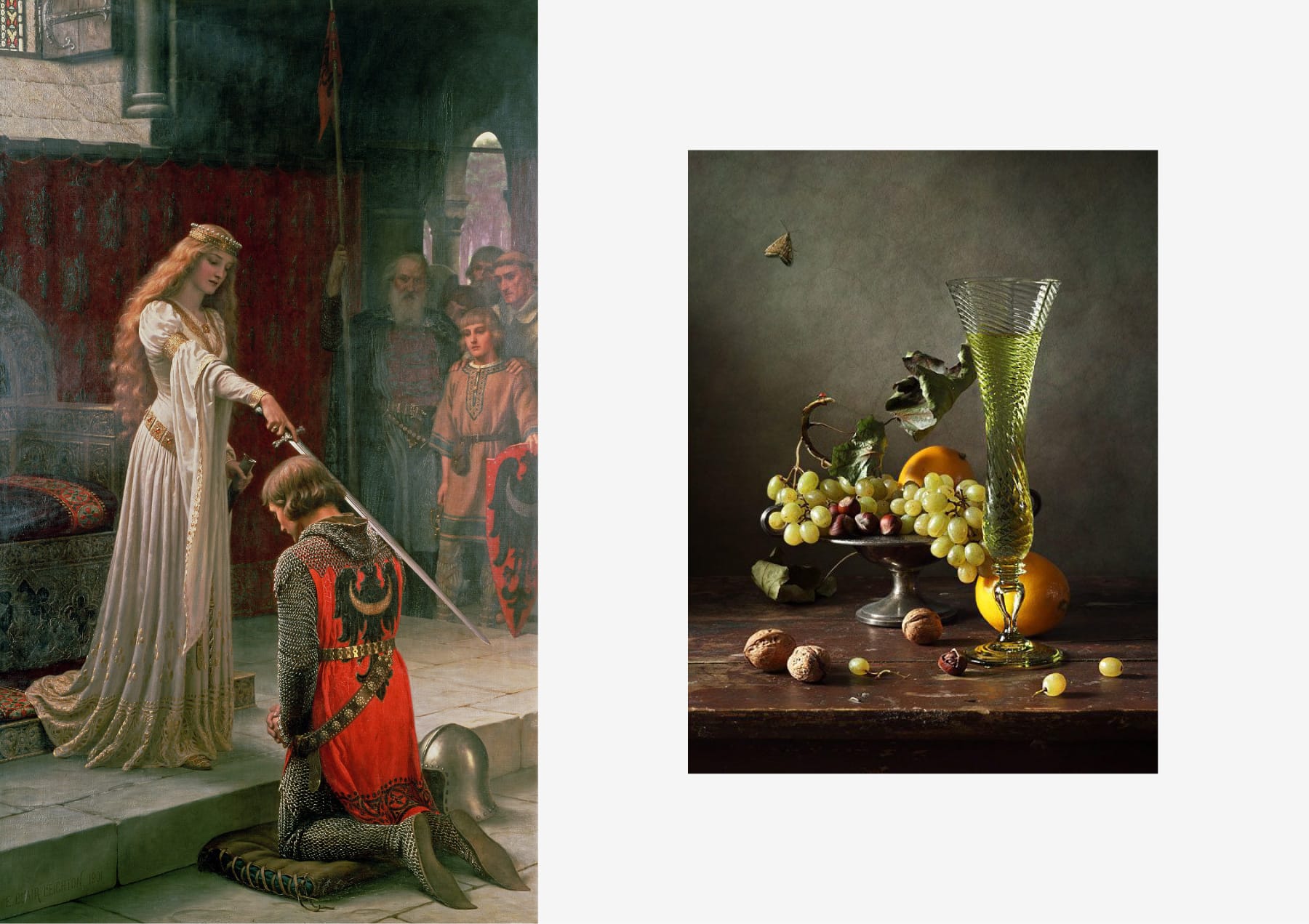 Left: Painting Accolade by Edmund Blair Leighton, 1901. Right: